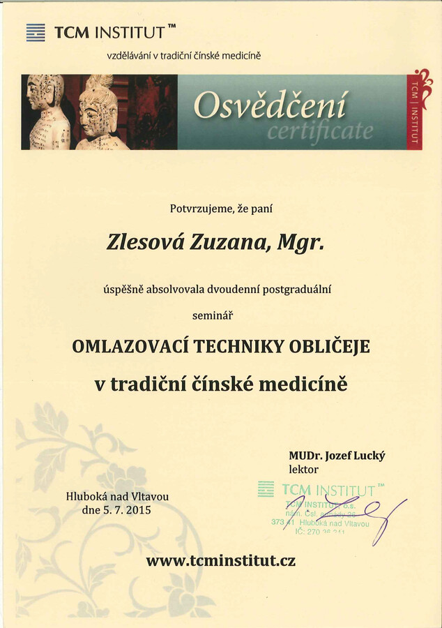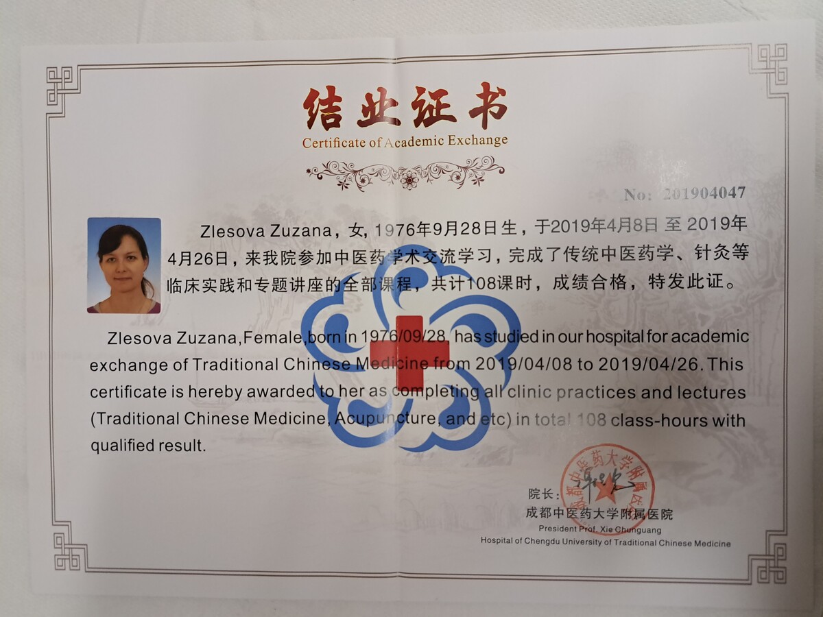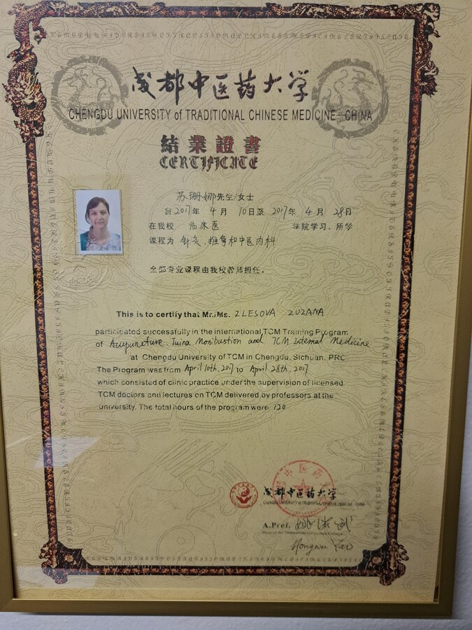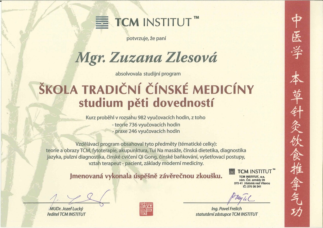 Po mateřské dovolené jsem se rozhodla vrátit ke studiu a získat odborné znalosti v oblasti Tradiční čínské medicíny. Absolvovala jsem 4letý studijní program ŠKOLA TRADIČNÍ ČÍNSKÉ MEDICÍNY (TCM) na TCM Institutu v Praze, který zahrnoval teorii a obrazy TCM, fytoterapii, akupunkturu, Tuina masáže, čínskou dietetiku, diagnostiku jazyka a pulsu, čínské cvičení Qi gong, čínské baňkování, vyšetřovací postupy, vztah terapeut – pacient a základy moderní medicíny. Součástí studia bylo také 246 hodin praxe.