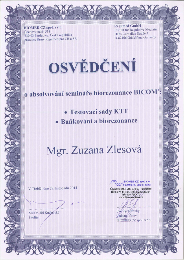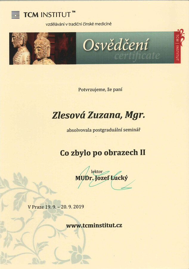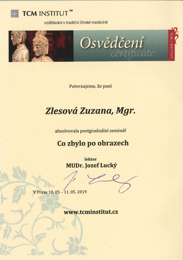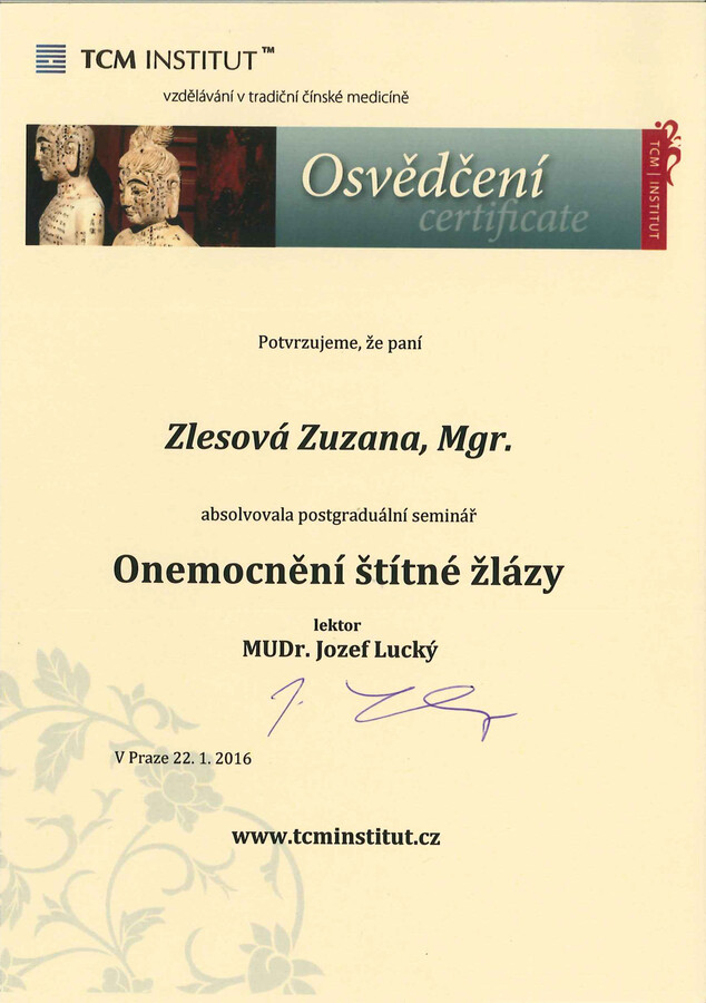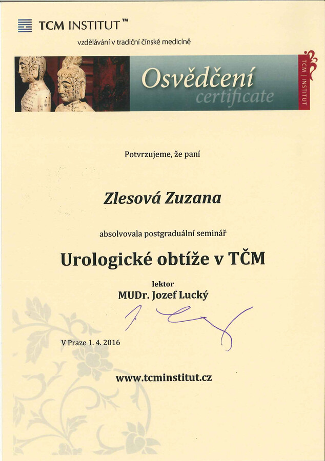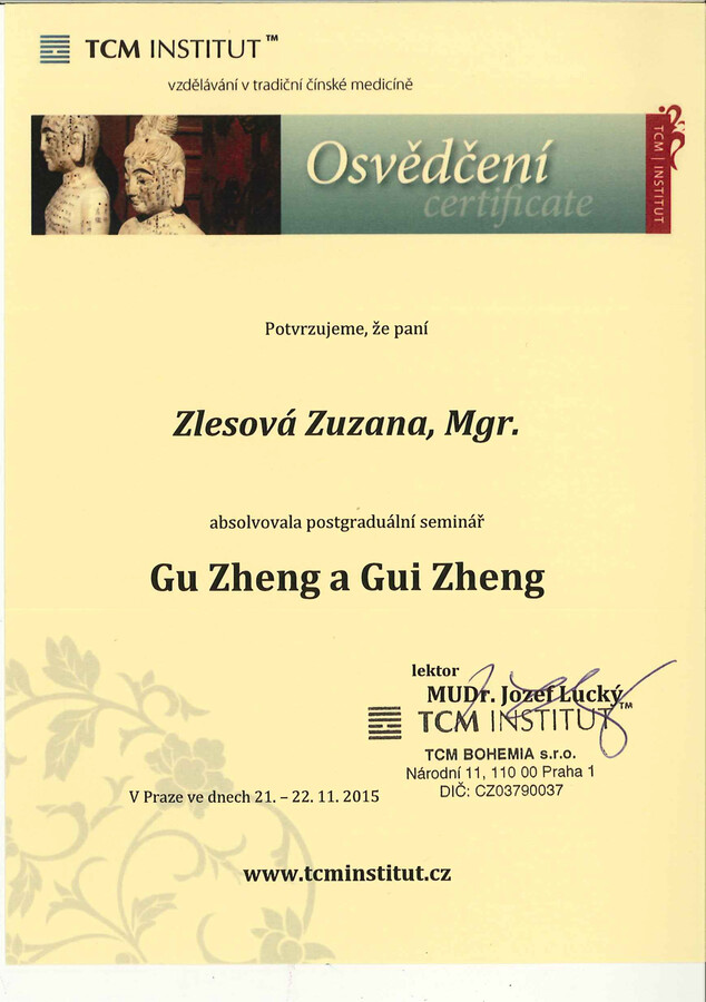 Po mateřské dovolené jsem se rozhodla vrátit ke studiu a získat odborné znalosti v oblasti Tradiční čínské medicíny. Absolvovala jsem 4letý studijní program ŠKOLA TRADIČNÍ ČÍNSKÉ MEDICÍNY (TCM) na TCM Institutu v Praze, který zahrnoval teorii a obrazy TCM, fytoterapii, akupunkturu, Tuina masáže, čínskou dietetiku, diagnostiku jazyka a pulsu, čínské cvičení Qi gong, čínské baňkování, vyšetřovací postupy, vztah terapeut – pacient a základy moderní medicíny. Součástí studia bylo také 246 hodin praxe.